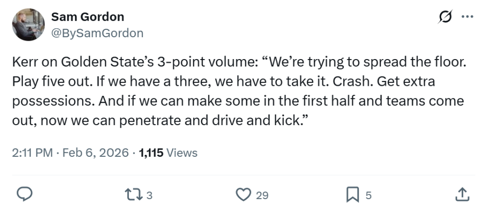 而勇士队之所以能够拿下胜利,主帅科尔的变阵与用人成为关键,半场疯狂出手37记三分创造NBA历史纪录,半场在篮下0-3英尺仅出手5次,只造成了一次投篮犯规,可谓是将对于三分投射的依赖发挥到了极致。