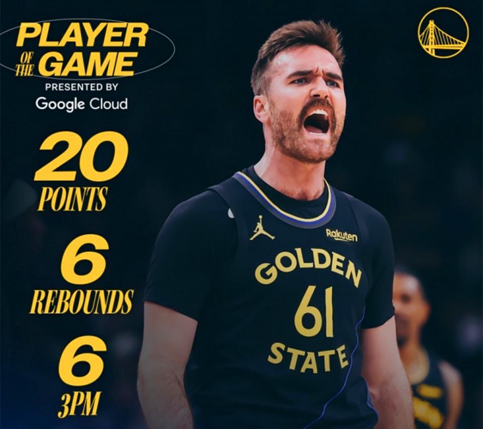 除了他之外,梅尔顿、桑托斯、小佩顿、霍福德也都得分上双,并且至少命中2记三分,这让勇士队全场命中20记三分,最终拿下这场强强对话。