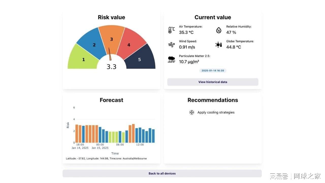 澳网将上述搜集的数据,通过算法计算得出一个1-5级的分量级表,再将级数实时显示在仪表盘上,这套系统还可以对未来几个小时的级数进行预报。